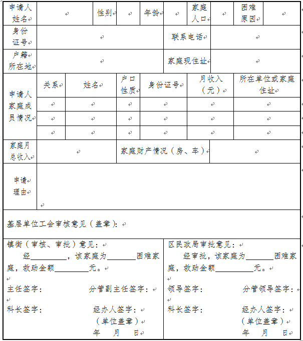 填表說明:困難原因填寫患大病、下崗失業(yè)、女子上學(xué)或意外等原因。此表一式兩份,分別報(bào)送鎮(zhèn)街社會事務(wù)科和工會。