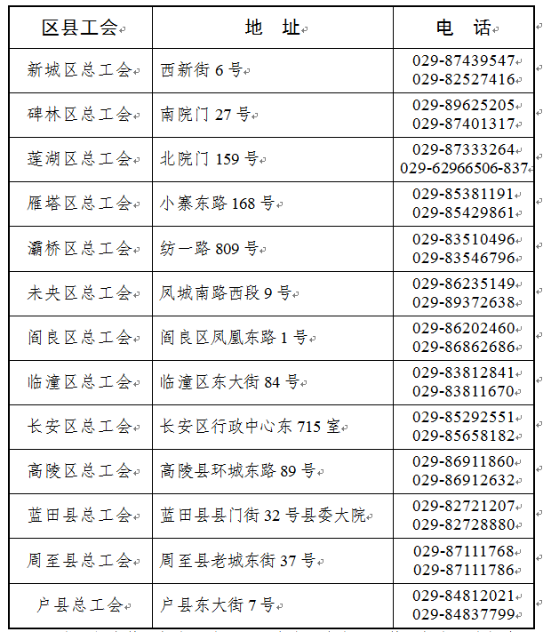 說明:電話欄中第一部電話為區(qū)縣工會辦公室電話,第二部電話為保障工作、援助中心部門電話。